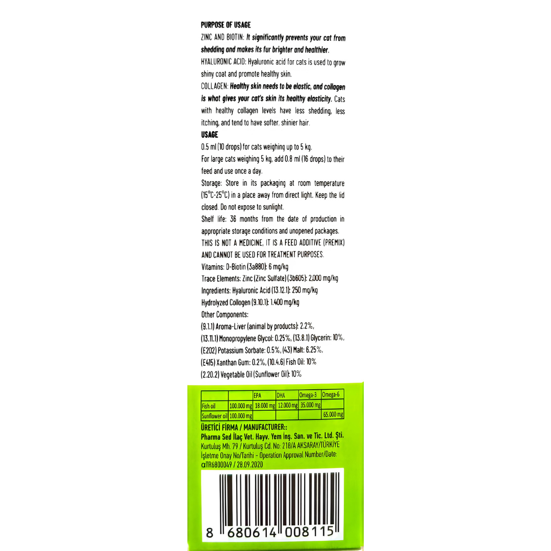 • Kolajen: Sağlıklı bir cildin elastik olması için gereklidir, kedinizin cildine sağlıklı elastikiyetini verir.